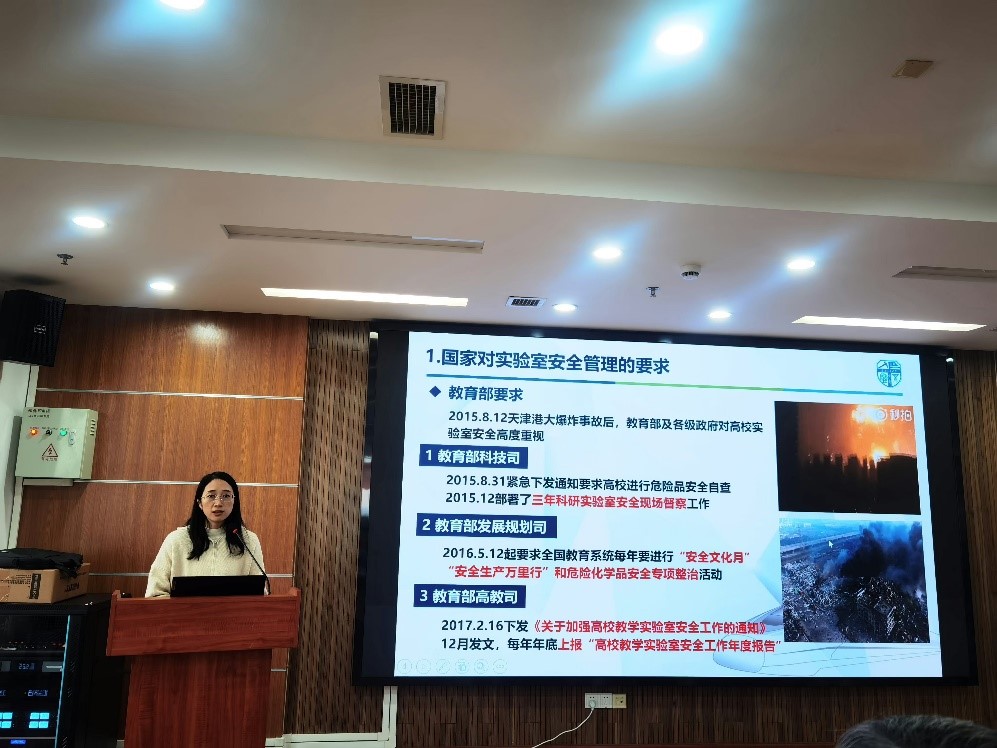 赵春花老师为师生带来了一场内容丰富的实验室安全培训。她详细介绍了国家对实验室安全管理的严格要求,阐述了学校实验室安全管理的具体工作,介绍了学校实行的“统一领导、分级负责、责任到人”的三级管理模式。她聚焦于安全隐患,通过列举插线板乱接、实验室物品堆放杂乱等常见问题,提醒师生在日常工作和学习中要时刻警惕这些安全隐患,鼓励大家积极参与学校实验室安全教育宣传活动,增强安全意识和自我保护能力。