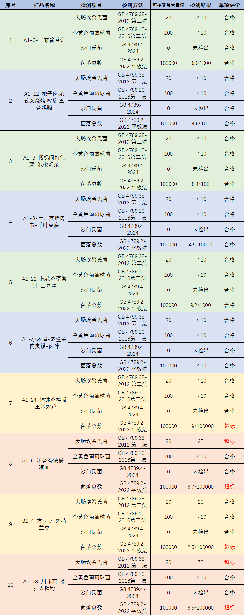 本次抽检选取大肠埃希氏菌、金黄色葡萄球菌、沙门氏菌及菌落总数作为核心指标,其中:大肠埃希氏菌、金黄色葡萄球菌、沙门氏菌均为食源性致病菌,对食品安全构成严重威胁。其次,菌落总数作为综合卫生指标,反映食品中活菌总量,是评估卫生质量的重要依据。这几项检测指标能够全面覆盖食源性致病菌、条件致病菌及基础卫生指标,有效评估食品微生物污染程度与安全风险,为保障食品安全提供坚实的技术支撑。