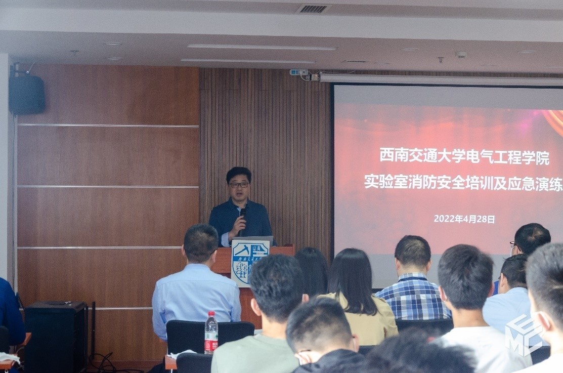 为进一步普及实验室安全知识,提高师生安全防范意识和能力,助力平安校园建设,营造“学安全、懂安全、会安全”的实验室安全文化氛围,4月28日下午,由学校党政办公室、资产与实验室管理处、科学技术发展研究院、保卫处联合举办,电气工程学院承办的实验室安全培训及应急演练在犀浦校区电气馆成功举行。党政办公室副主任孟新智,资产与实验管理处副处长卫飞飞,保卫处副处长朱云峰,科学技术发展研究院王芳老师以及机关职能部处相关人员、电气工程学院党委书记罗乾超、副书记谢力,副院长解绍锋以及辅导员、实验室安全员,实验室教师、各实验室研究生共计90余人参加。本次活动还邀请到郫都消防大队段程工指导员做专业指导。活动由解绍锋副院长主持。