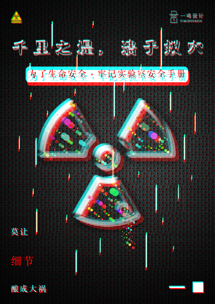 设计理念:两幅海报属于系列作品。传达出的观念是在实验室操作时要注意细节,不要因小失大,做实验前要了解实验规范和实验室安全手册,不要因为这些小的地方导致自己出现巨大的错误。4号作品运用了生化辐射的形象,在其内部填充色彩斑斓的小球,就如同自然界毒蘑菇带给人的感受类似,这种颜色会给人带来一种迷惑感和危机感,我又整体做了一个故障风格的效果处理,起到了一个增大事故效果的作用,比较能让实验室事故的影响对人产生共鸣,从而让看过这副海报作品的人在以后的实验过程中更加注意实验规范。5号作品运用了全家福的形象,把“实验者”因实验室事故死亡和这个形象结合起来,将“实验者”的形象剔除,也是想传达出要在实验室操作时注意细节,操作时注意生命安全,否则可能就是和家人的永别,自己和家人都承担了很大的痛苦,这副作品本质上时把亲情和实验室安全行为规范联系起来,起到一个抛砖引玉的作用。让观者可以从一个小小的实验室安全规范联系到如果出了安全事故可能会失去亲情这个层次。相框和光影以及玻璃的破碎感都是为了烘托氛围而添加的,能能扩大这种公情的效果。