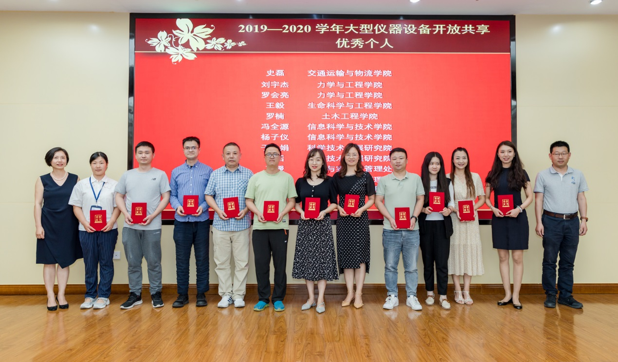 资产与实验室管理处贺剑处长代表学校宣布《best365中国官方网站关于表彰2019—2020学年大型仪器设备开放共享先进集体、优秀机组和优秀个人的决定》,朱健梅副校长、科学发展研究院、党委组织部(人才工作办公室)、战略与学科处、研究生院、人事处、计划财务处、信息化与网络管理处等单位领导为获奖单位、机组和个人颁奖并合影留念。