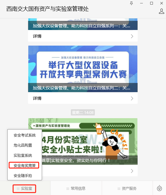 参与答题方式一:扫描二维码关注国有资产与实验室管理处微信公众号,选择“实验室”—“安全有奖竞答”,可多次重复答题直至满分,最后我们将根据得满分的次数,分等级发放奖品,欢迎全校广大师生踊跃参与!