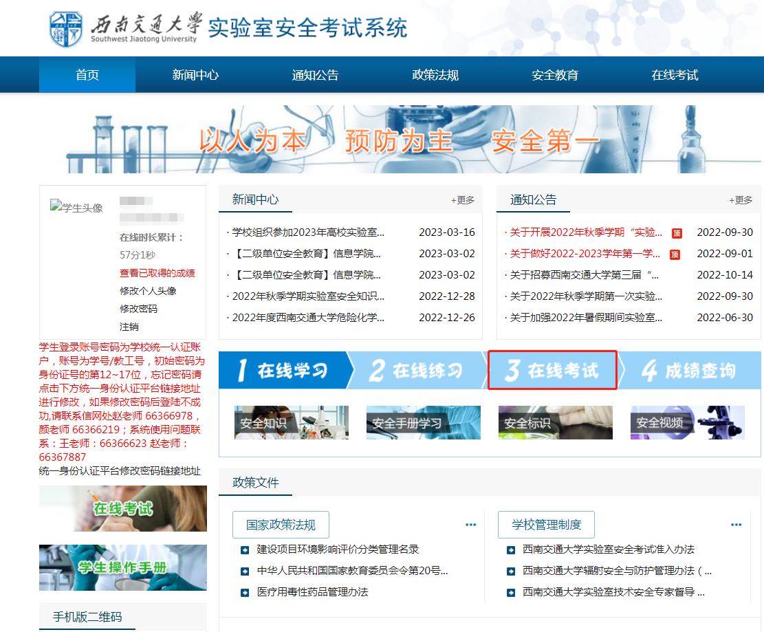 1、电脑端登录网址:http://aqks.swjtu.edu.cn/,登录方式为使用学校统一身份认证账号登录(初始密码为身份证号的第12-17位),选择 “在线考试”。