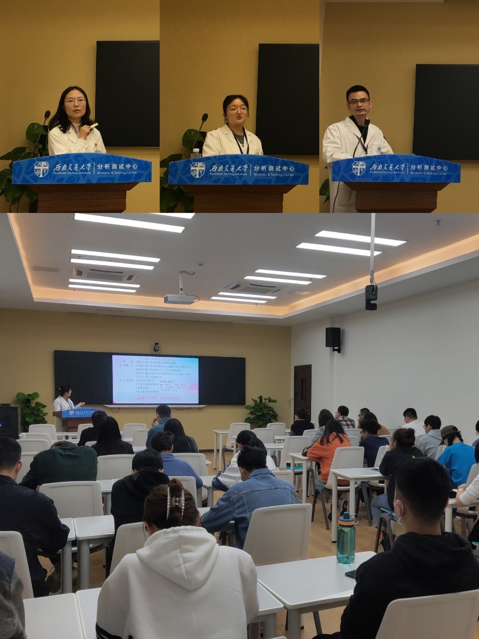 首先,胡张梅老师向大家介绍了中心整体的安全管理要求,主要有学校的安全管理办法和本中心的安全管理办法。另外,就大型仪器设备操作注意事项进行了详细的介绍,包括实验前、中、后三个阶段的应急处置。同时,也着重强调了送样的要求,实验室环境卫生等事项。