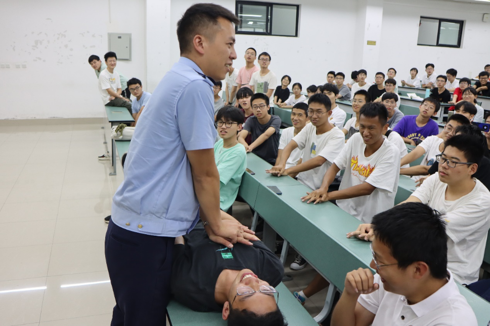曾教官以“落实安全责任,推动安全发展”为主题,为新生开展消防安全专题教育。通过一个个鲜活的事例,曾教官向师生们列举了由于消防意识淡薄而造成的的严重火灾事故,并以现场教学的方式给同学们讲授海姆立克急救法和心肺复苏等紧急救援方法,演示了灭火器、消防毯、消防面具等一系列消防器材的使用方法。讲座结束,曾教官组织新生代表进行应急疏散演练,让同学们深度体验火灾一线逃生场景。