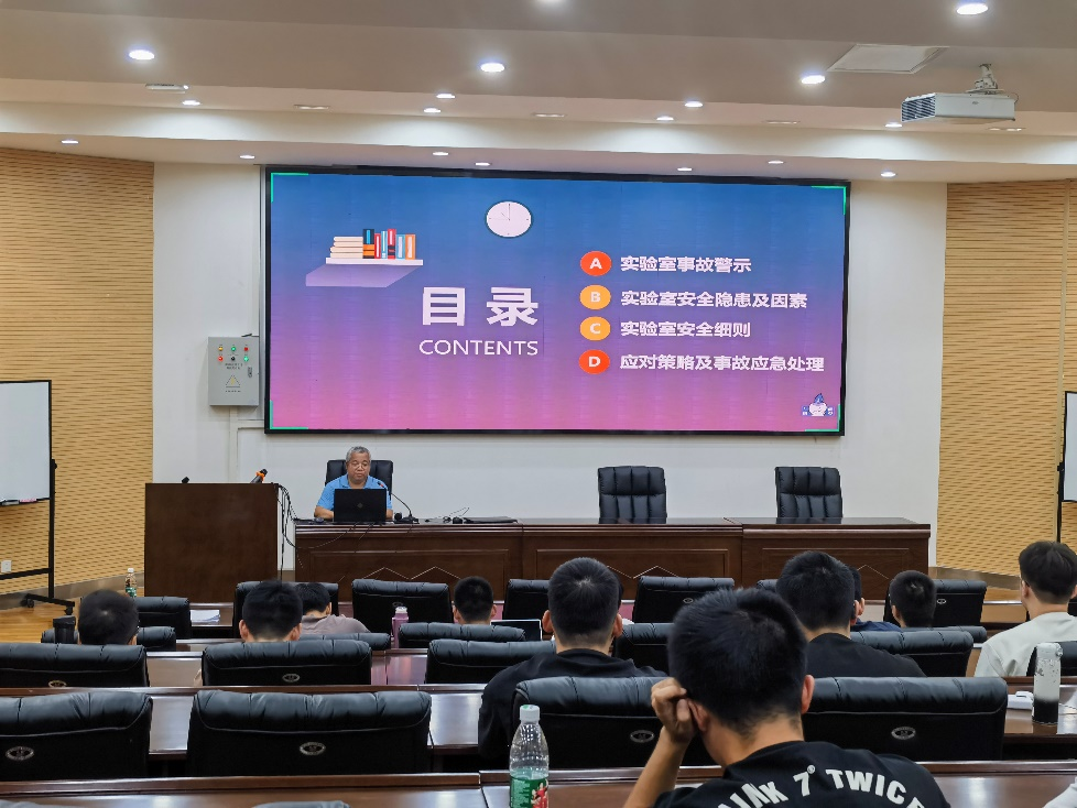 解绍锋副院长首先阐述了实验室安全的重要性,这是跟以前本科阶段实验室的安全是有本质的区别,学习和了解实验室安全知识将是保障大家在之后的科研活动中安全重要基础。同时也要求大家大今后的科研活动中一定要遵守实验室安全的各项规范,了解实验设备的性能,保持良好的实验室环境。