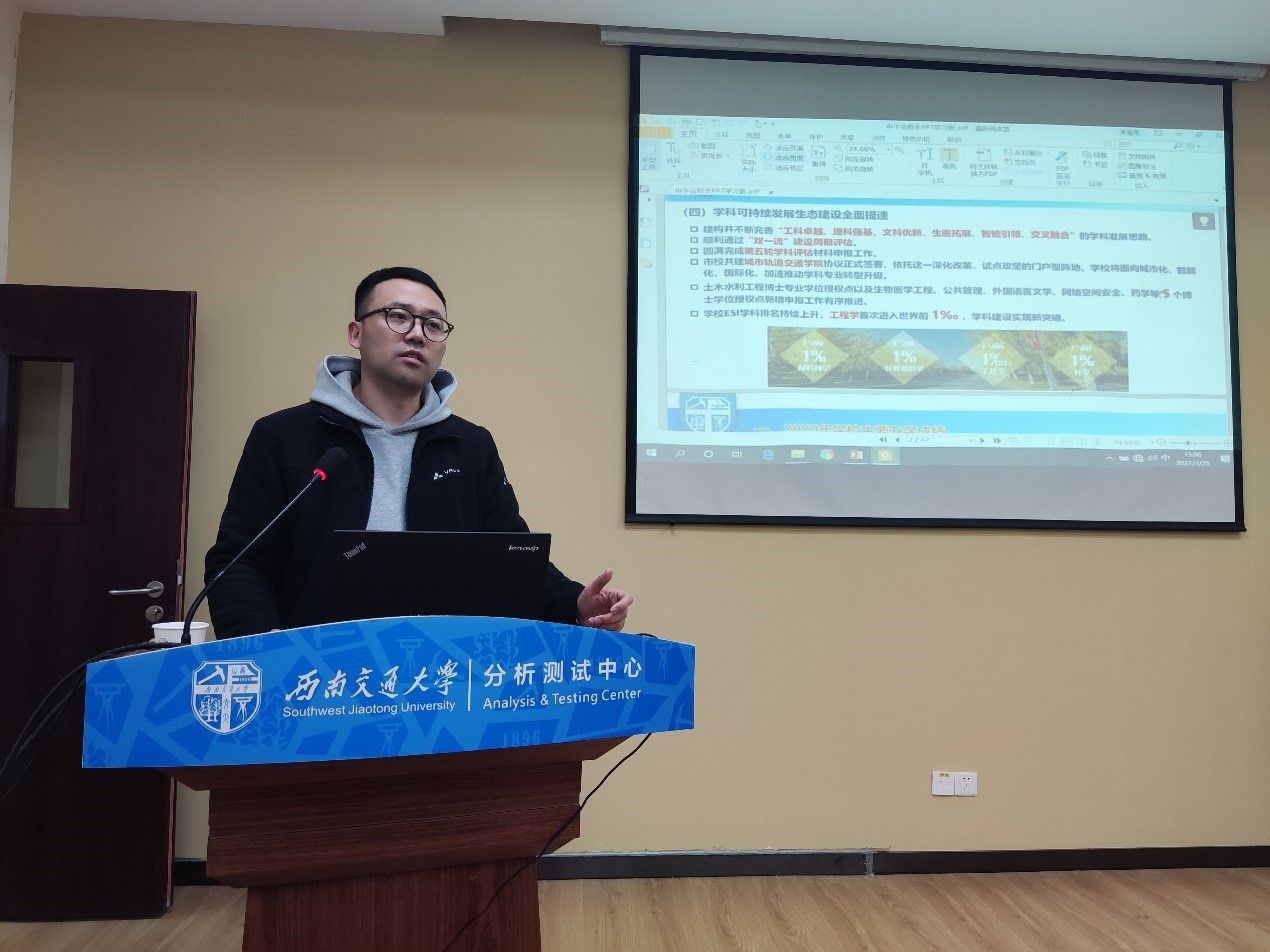第二阶段,由分析测试中心办公室主任詹弘同志,以“百年党史、砥砺前行”为题,从学重要讲话、夯理论之基、铸精神之魂、战“疫”进行时四个方面,结合自身学习感受,带领与会人员共同开展党史学习。随后,根据处内政治学习与业务学习密切结合要求,詹弘同志还详细介绍了分析测试中心的发展历史、发展现状、定位及服务内容、发展规划,并带领与会人员一同参观了分析测试中心实验室。通过业务学习,不仅让全处人员对校级分析测试平台有了更深刻的了解,更加强了处内业务开展的沟通和理解。
