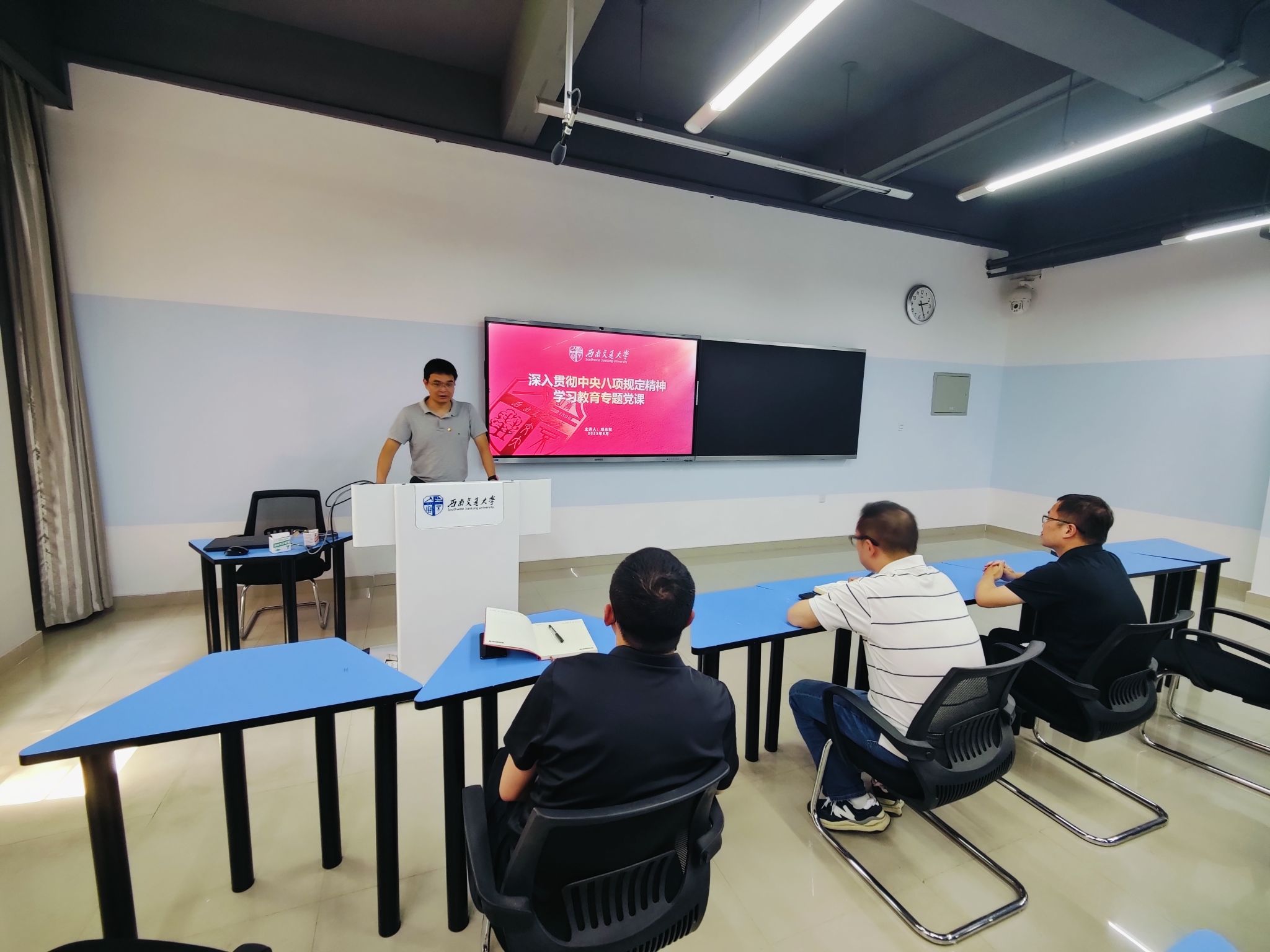 邓永权同志首先以“深入贯彻中央八项规定精神”为题讲授专题党课。他系统阐释了中央八项规定精神的核心内涵与重大意义,并结合相关领域典型案例进行剖析。邓永权同志强调,中央八项规定精神是全面从严治党的关键要求,与国有资产管理工作廉洁、规范、高效的本质属性高度契合。全体党员必须时刻保持警醒,将规定精神内化于心、外化于行:严守纪律红线,在资产购置、处置等关键环节依法依规操作,杜绝违规行为;强化作风建设,深入教学科研一线优化服务,力戒形式主义官僚主义;厉行勤俭节约,牢固树立“过紧日子”思想,精打细算管好用好学校国有资产。