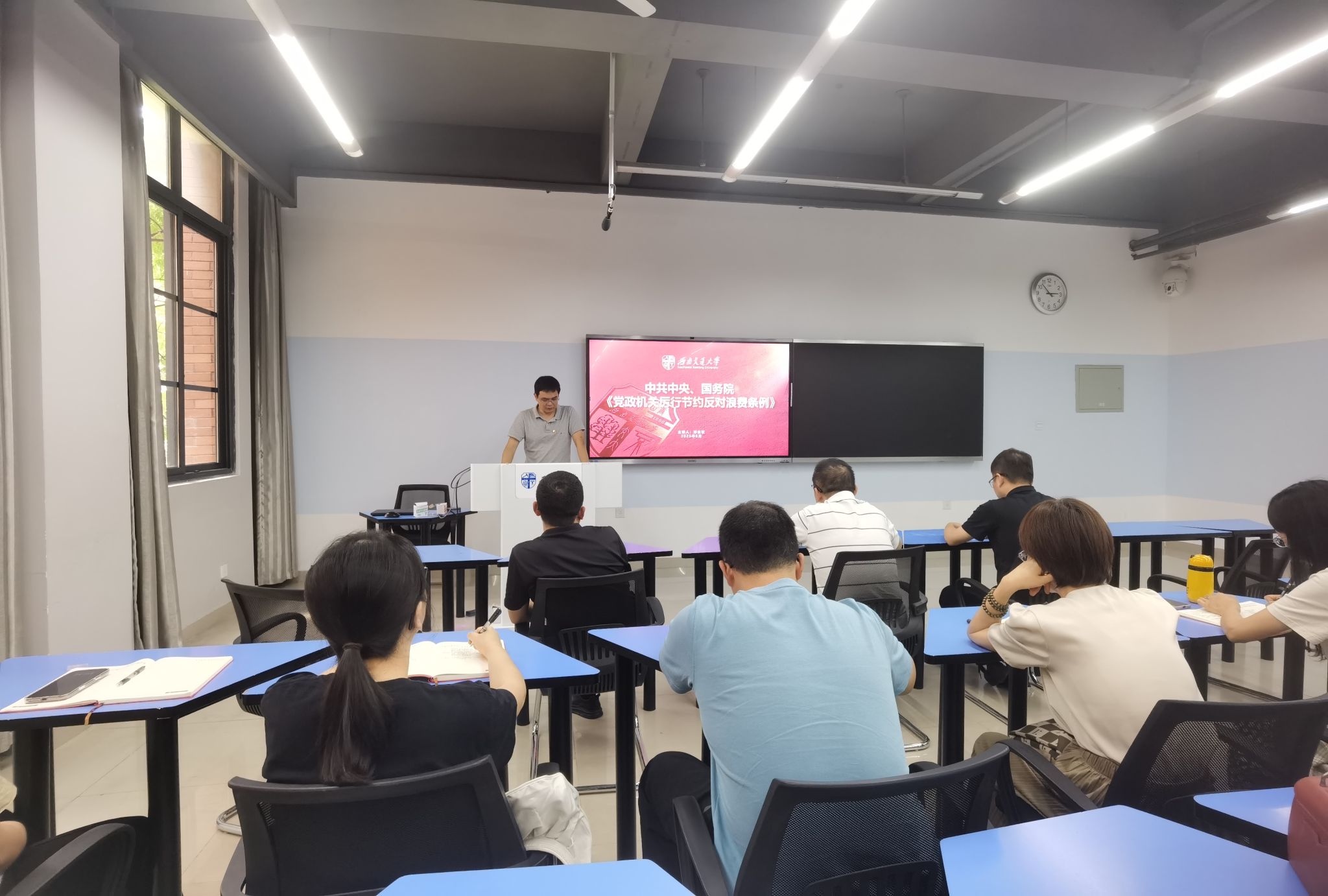 2025年6月5日下午,国有资产与实验室管理处党支部在犀浦校区九号教学楼X9202教室开展6月主题党日活动。活动由支部书记邓永权同志主持并领学,全体党员围绕深入贯彻中央八项规定精神学习教育及新修订的《党政机关厉行节约反对浪费条例》开展专题学习。
