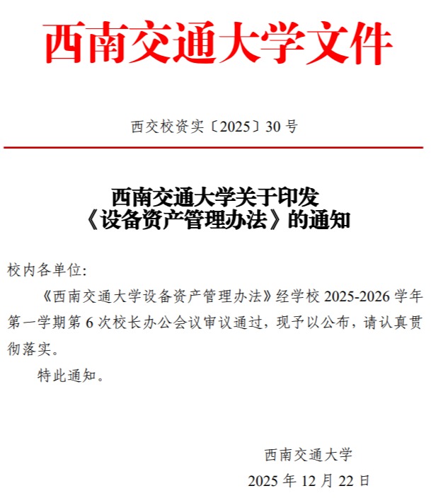 学校新出台设备、家具资产管理办法为加强学校设备、家具资产规范管理,全面提升资产使用效益与管理效能,学校最新发布了《best365中国官方网站设备资产管理办法》(西交校资实〔2025〕30号)《best365中国官方网站家具... -